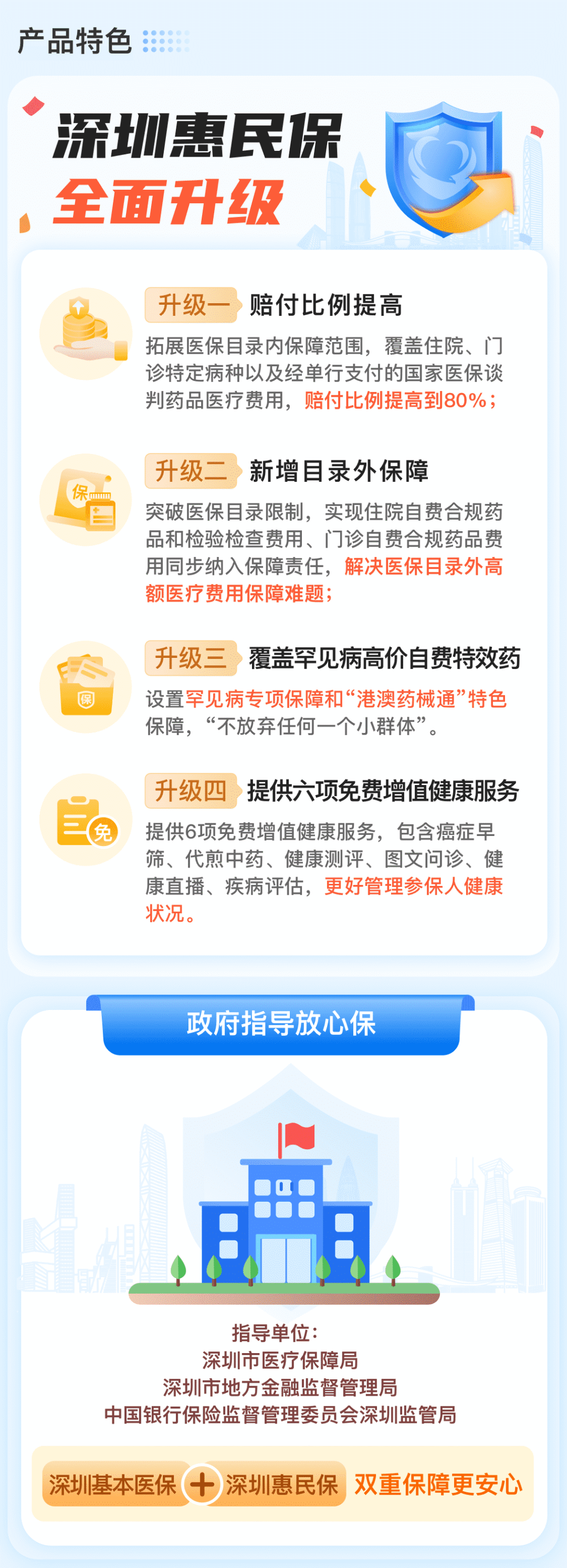 “深圳惠民保”是由中国人寿保险股份有限公司深圳市分公司、中国人民财产保险股份有限公司、中国人民健康保险股份有限公司深圳分公司、平安健康保险股份有限公司共同承保,由深圳市医疗保障局、深圳市地方金融监督管理局和中国银行保险监督管理委员会深圳监管局共同指导的普惠型商业补充医疗保险。