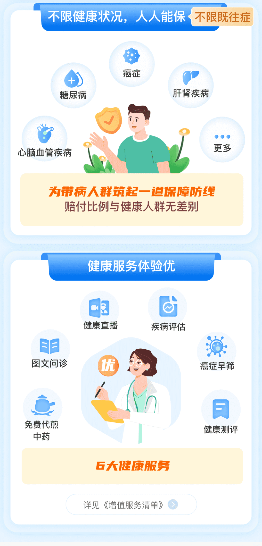 包含癌症早筛、代煎中药、健康测评、图文问诊、健康直播、疾病评估,更好地管理参保人健康状况。